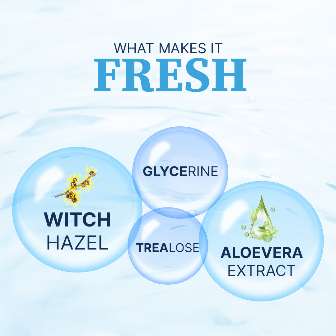 Ghrit Kumari(Aloe Barbadensis)1%, Glycerin (Glycerol) 1.5%, Nimb (Azadirachta Indica) 0.5%, Tulsi (Ocimum Sanctum) 0.5 % , Base Qs- (Aqua, Hamamelis Virginiana (Witch Hazel) Water, Propylene Glycol, Perfume, Phenoxyethanol, Ethylhexylglycerin, Trehalose, Saccharide Isomerate Lactic Acid, Sodium Gluconate.) 96.5.